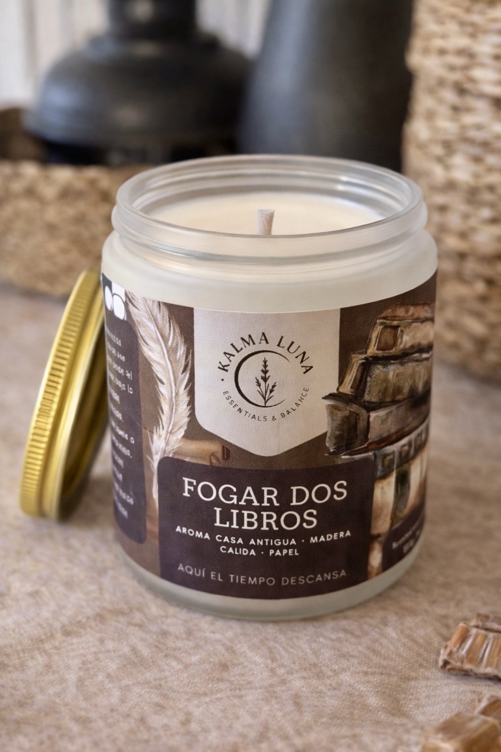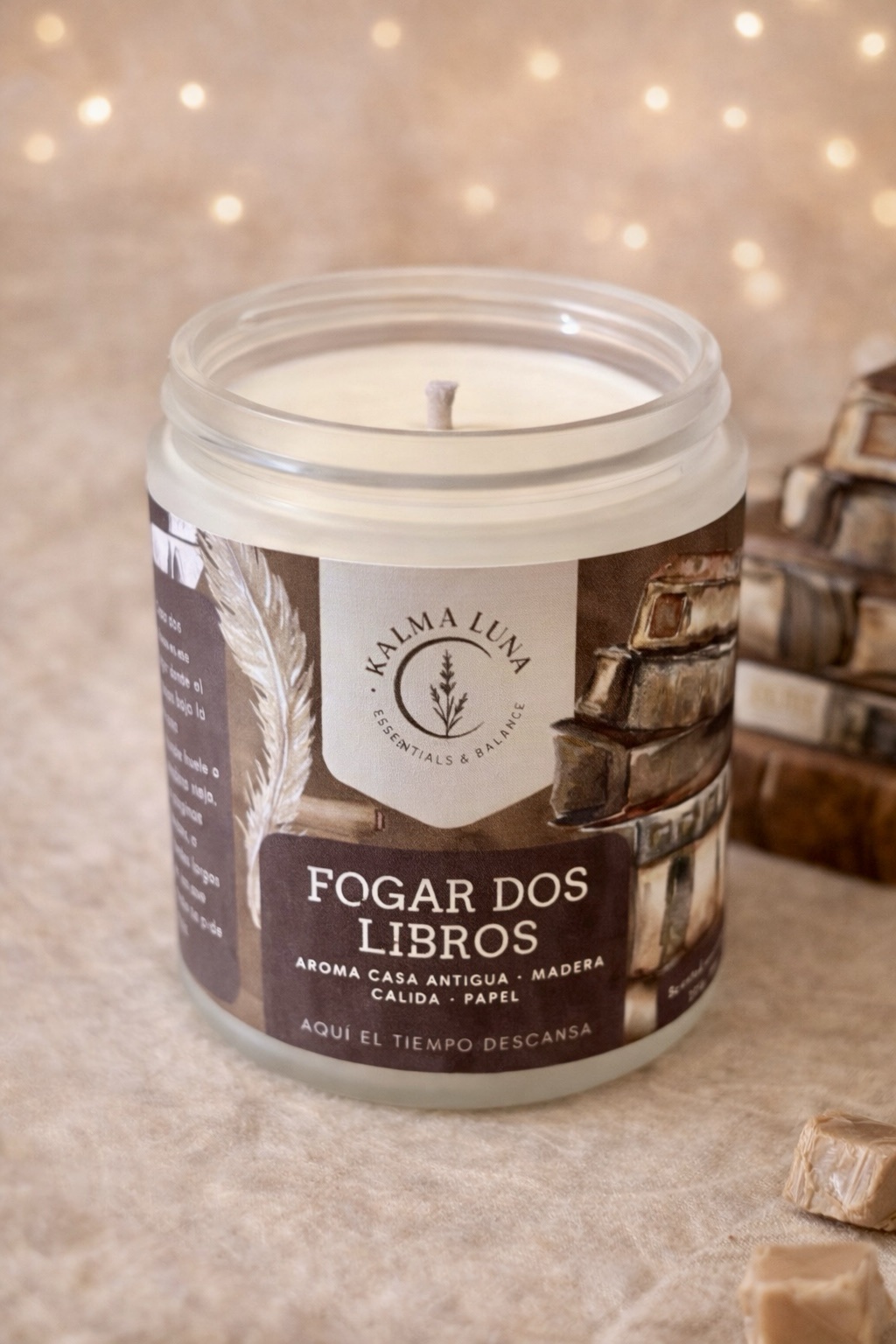 Su etiqueta en tonos tierra con ilustraciones de libros antiguos refleja su esencia: clásica y atemporal. Bajo el lema “Aquí el tiempo descansa”, esta vela es la invitación definitiva a apagar el teléfono, encender la mecha y sumergirte en tu lectura favorita. Su luz tenue y su aroma amaderado crean la atmósfera perfecta para la introspección y el estudio.