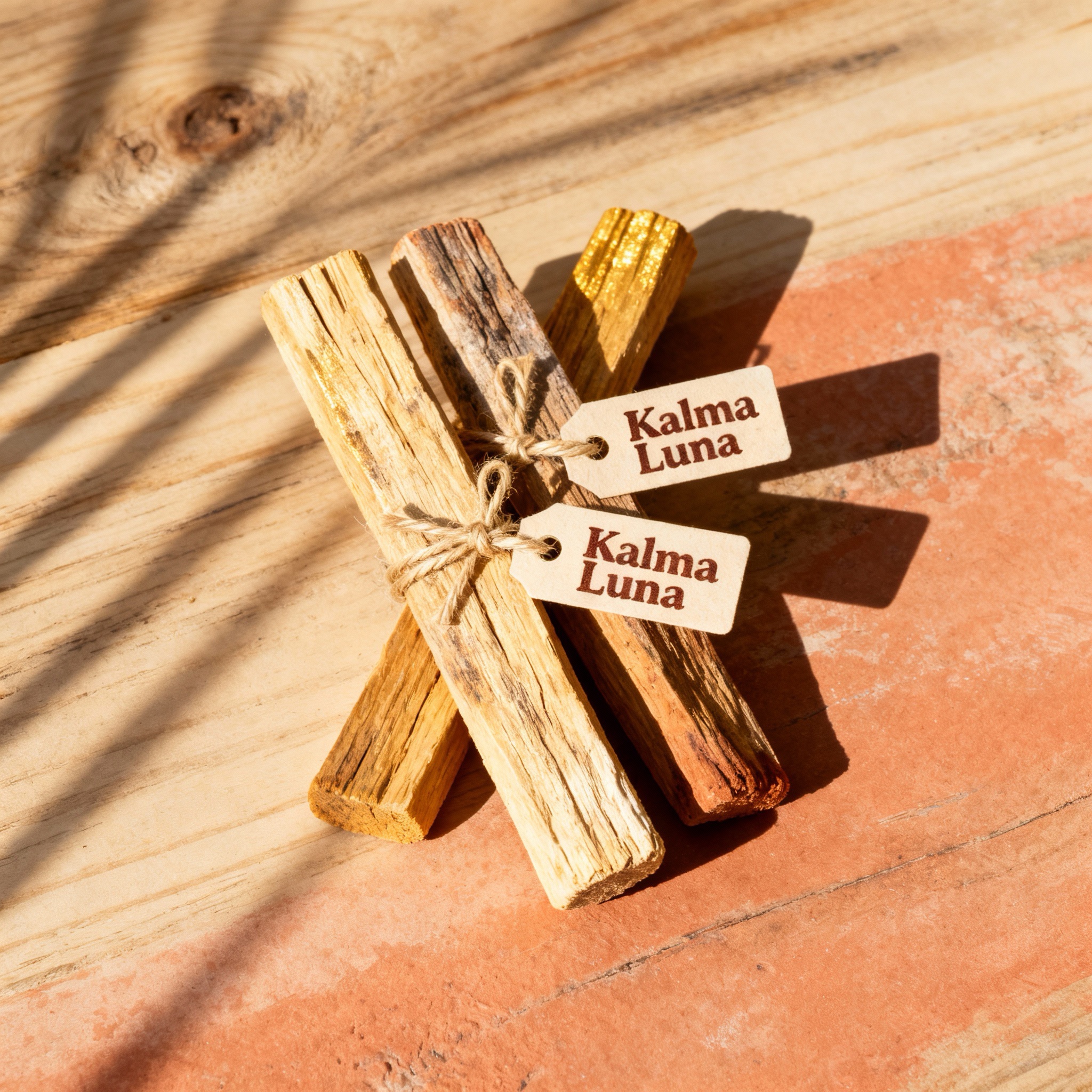 100% madera de Bursera graveolens. 3 unidades (aprox. 10 cm). De origen ético (no talado ni mezclado).Packaging minimalista, con hilo de algodón y etiqueta ritual. Incluye guía ritual para potenciar tu práctica.