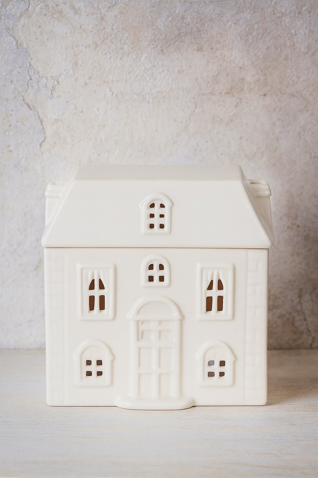Quemador de ceras y esencias en cerámica blanca con forma de casita. Aporta calidez y estilo nórdico a cualquier rincón y es perfecto para aromatizar el hogar con wax melts o aceites esenciales.