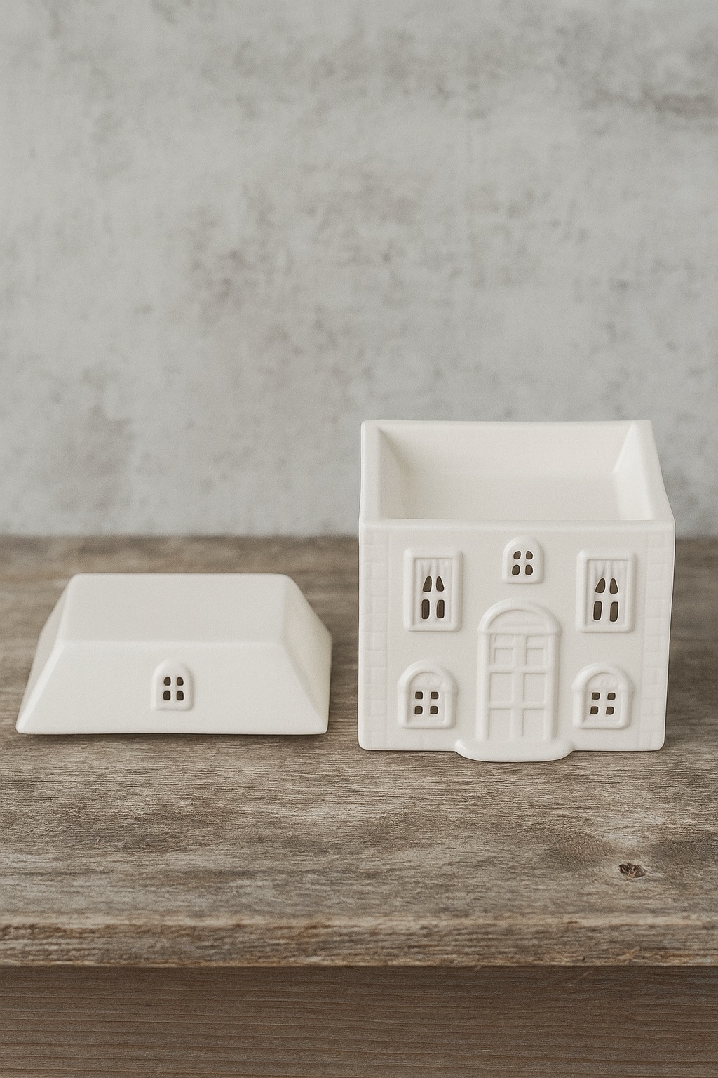 Deja que el aroma inunde tu hogar con el quemador cerámico casita blanca, una pieza decorativa y funcional para cualquier ambiente. Fabricado en cerámica de alta calidad, su diseño minimalista, con detalles en relieve de ventanas y puerta, crea un efecto acogedor al encender una vela de té en su interior.