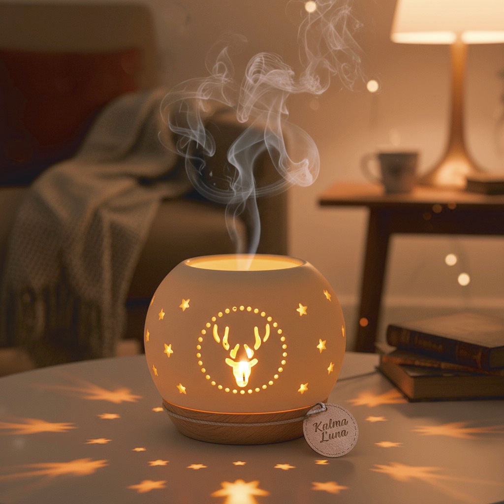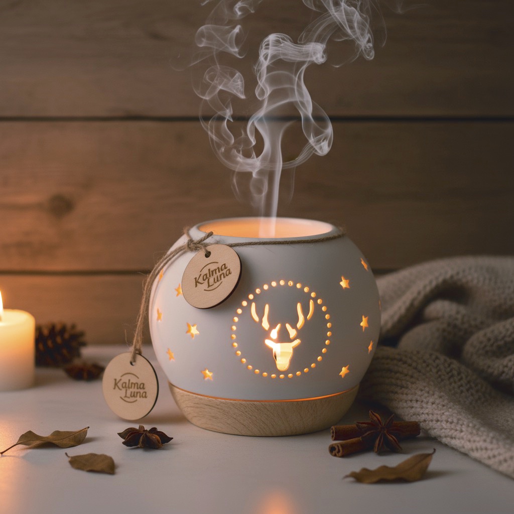 El Quemador de Cera Ciervo combina cerámica blanca y el beige simulando madera natural en un diseño elegante y cálido. Ideal para wax melts y aceites esenciales, difunde el aroma de forma uniforme mientras su luz interior proyecta un brillo suave a través del motivo de ciervo y estrellas. Perfecto para ambientar tu hogar en otoño e invierno, creando un espacio acogedor, decorativo y lleno de calma.