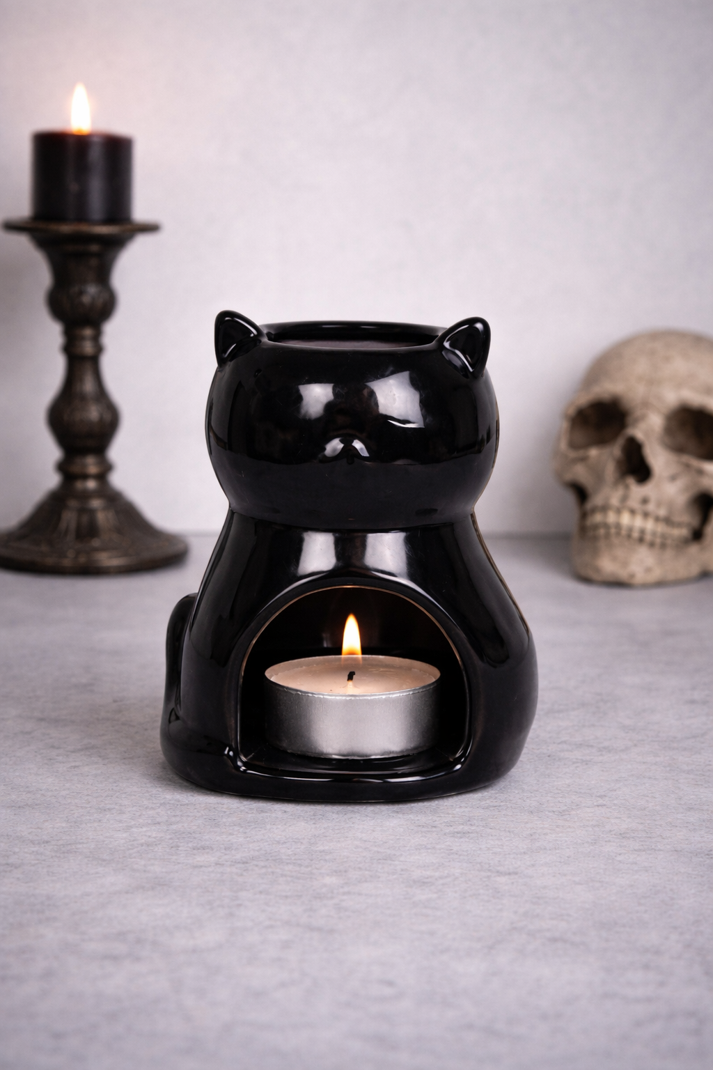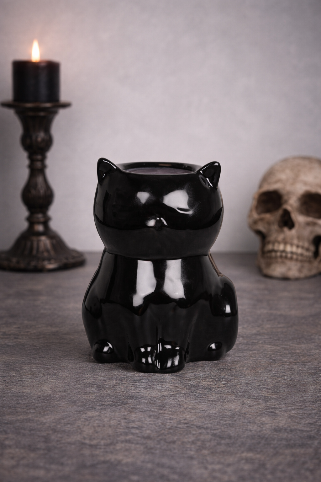 Su acabado negro brillante le da un aire gótico elegante, pero sencillo. Combina perfectamente con espacios cálidos, rincones espirituales o estéticas más oscuras y acogedoras.