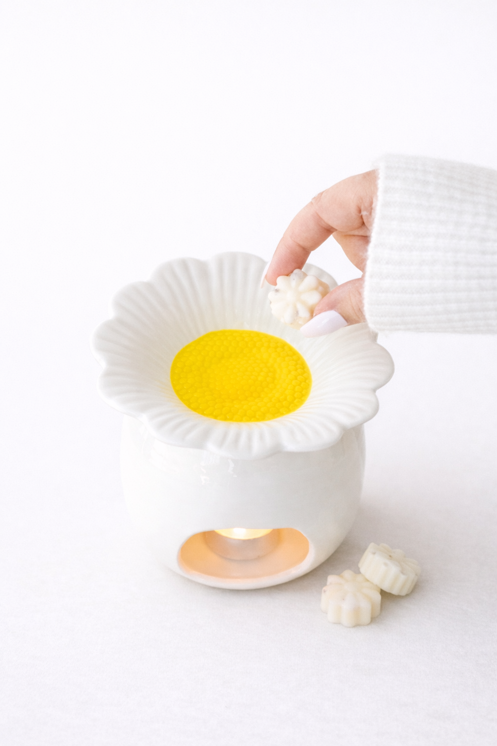 Fabricado en cerámica blanca, este quemador combina funcionalidad y decoración. La parte superior con forma de flor está pensada para colocar tus wax melts favoritos, mientras que en la base puedes introducir una vela tealight que, al calentarse, derrite suavemente la cera y libera su aroma por toda la estancia.