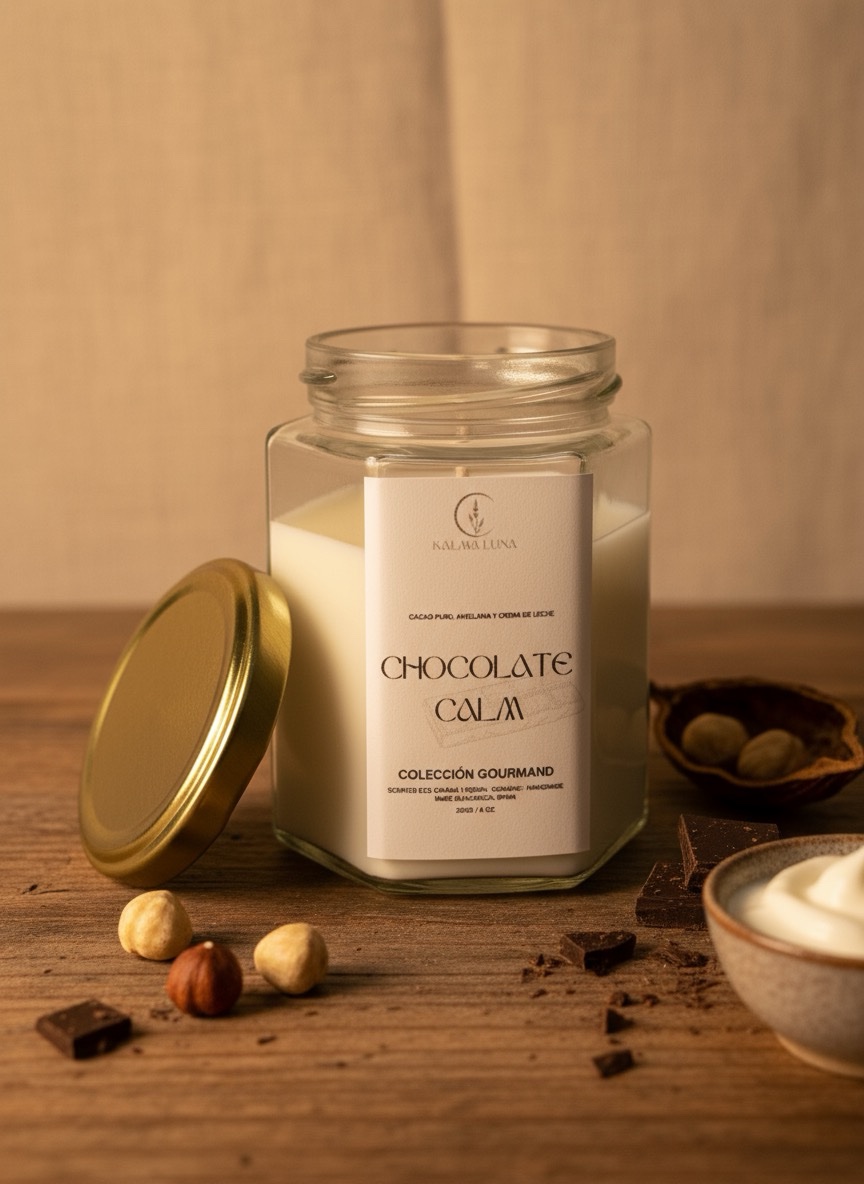 La vela Chocolate Calm pertenece a la colección Gourmand de Kalma Luna, una línea creada para los amantes de los aromas dulces, reconfortantes y llenos de placer sensorial. Su fragancia combina la intensidad del cacao puro, la suavidad de la vainilla natural y un leve toque cálido de sándalo, que equilibra la mezcla y la convierte en un refugio de calma envolvente.
