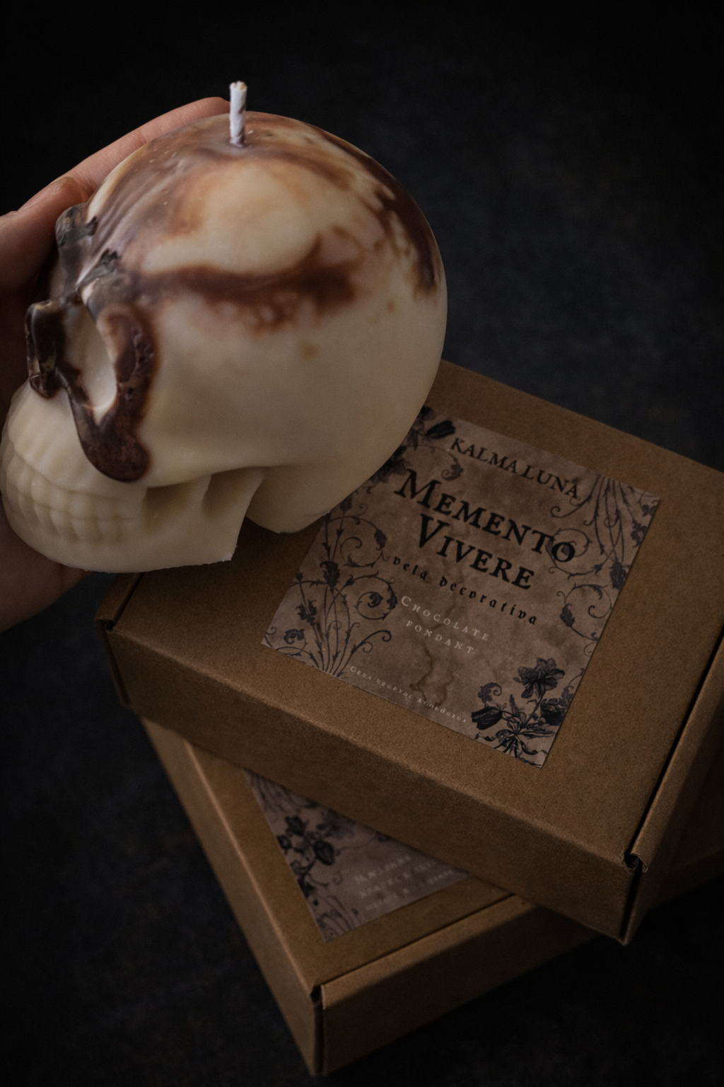 Inspirada en la tradición del vanitas pero con un giro moderno y goloso, Memento Vivere es una escultura de cera que celebra la vida a través de los sentidos. Si el destino final es la sombra, ¿por qué no disfrutar del camino con el aroma más dulce posible?