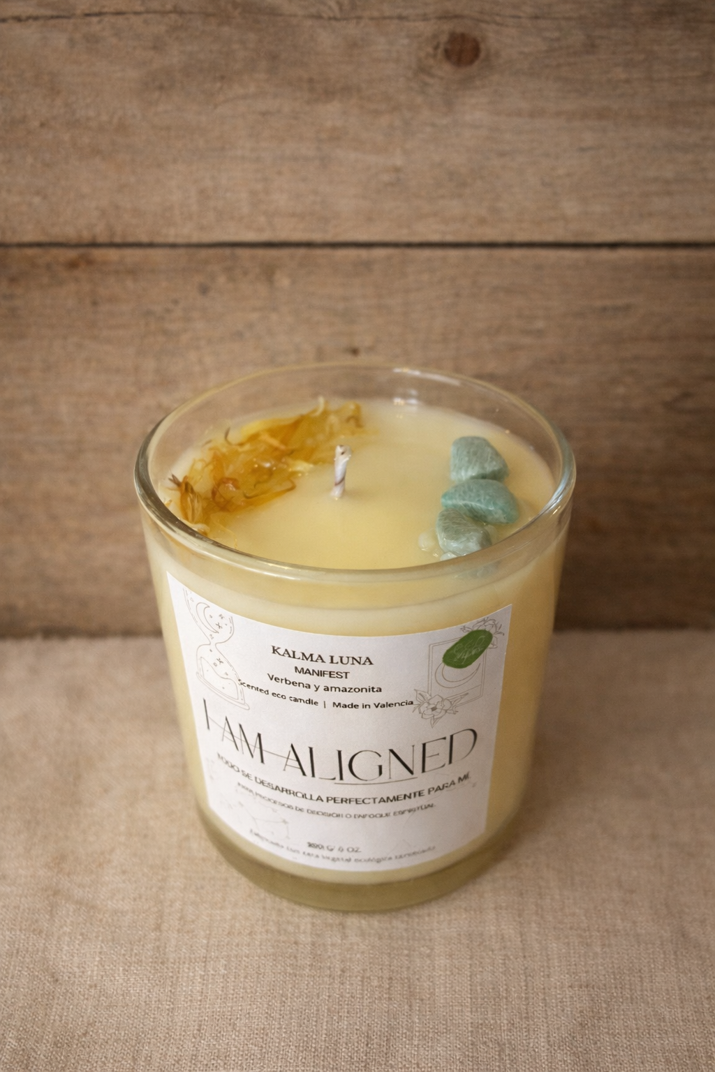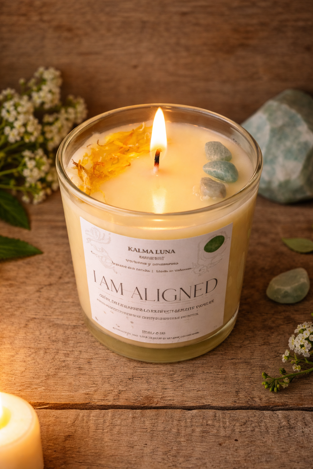 I AM ALIGNED es una vela ritual diseñada para acompañarte en momentos de enfoque, claridad y manifestación.