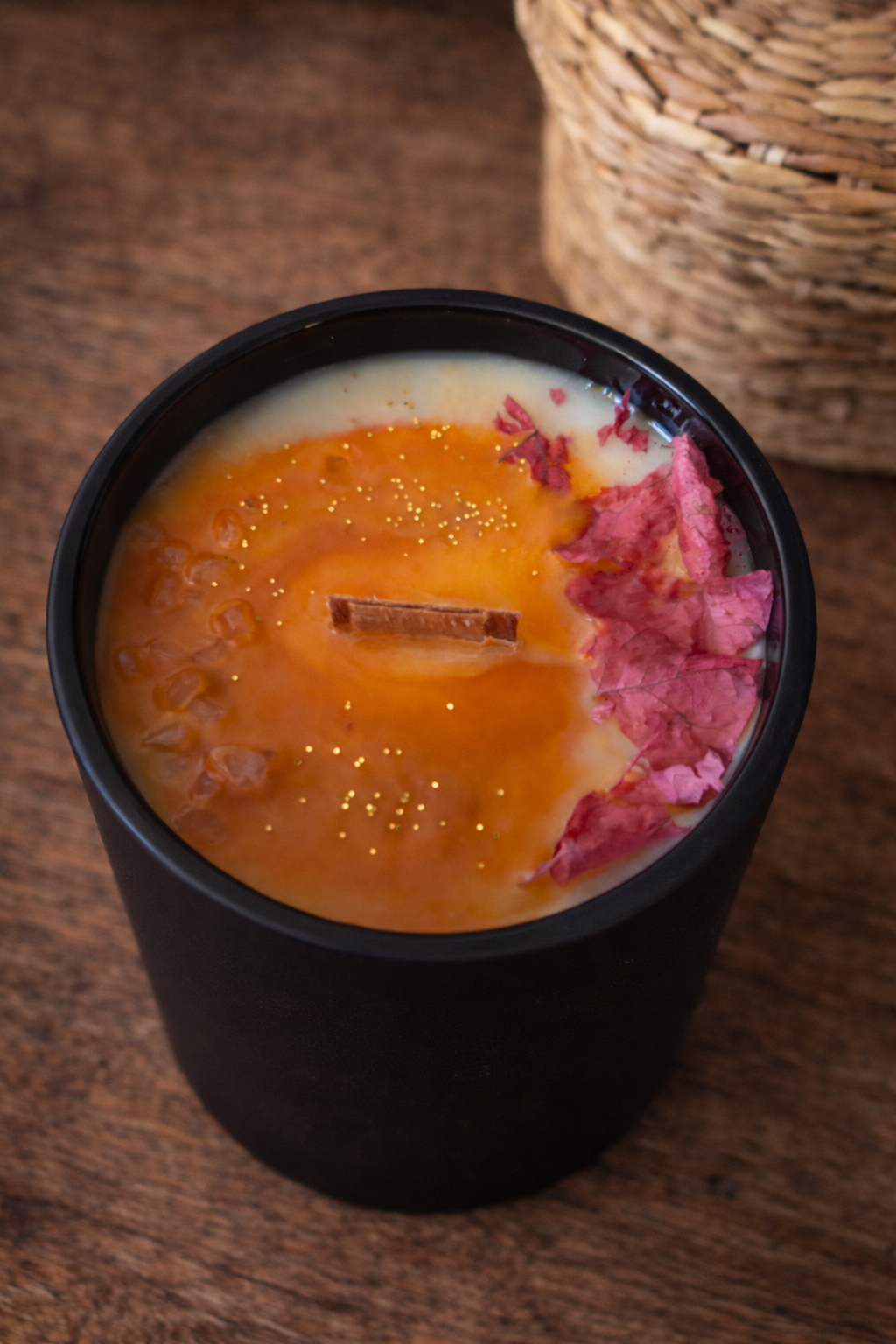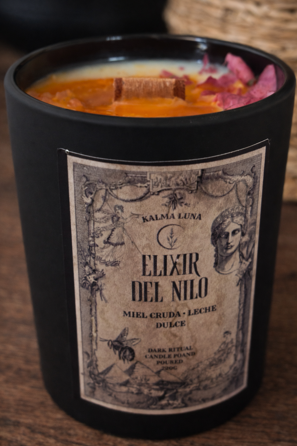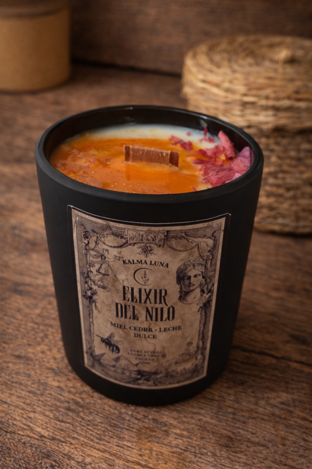 Presentada en un envase negro mate con una etiqueta de arte clásico, su superficie es un espectáculo visual: pétalos rosa intensos y destellos dorados que flotan sobre una cera que imita la textura de un elixir sagrado. Su mecha de madera orgánica garantiza una quemada limpia y el relajante sonido de una pequeña fogata.