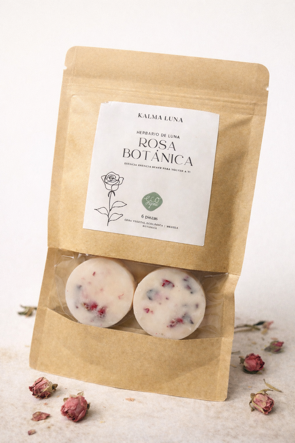 Cada pieza está elaborada con cera vegetal ecológica y una mezcla botánica real, pensada no solo para perfumar, sino para sostener pequeños rituales de amor propio.