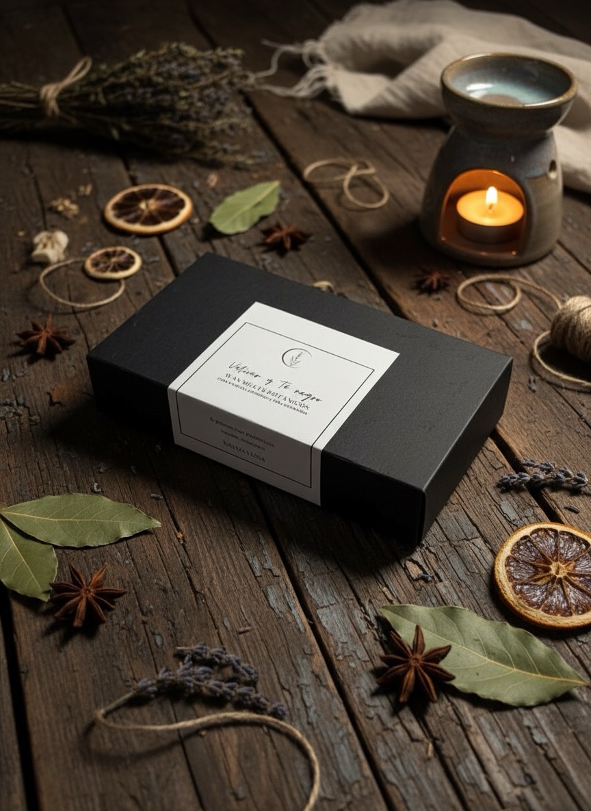 Los Wax Melts Botánicos Vetiver y Té Negro están elaborados artesanalmente con cera vegetal ecológica y decorados con elementos botánicos naturales. Su aroma terroso y cálido combina el vetiver con el té negro, creando una fragancia elegante y equilibrada. Veganos, sostenibles y libres de tóxicos, incluyen 6 cubitos aromáticos para quemadores. Perfectos para quienes buscan un ambiente natural, profundo y relajante con el sello de calma consciente de Kalma Luna.