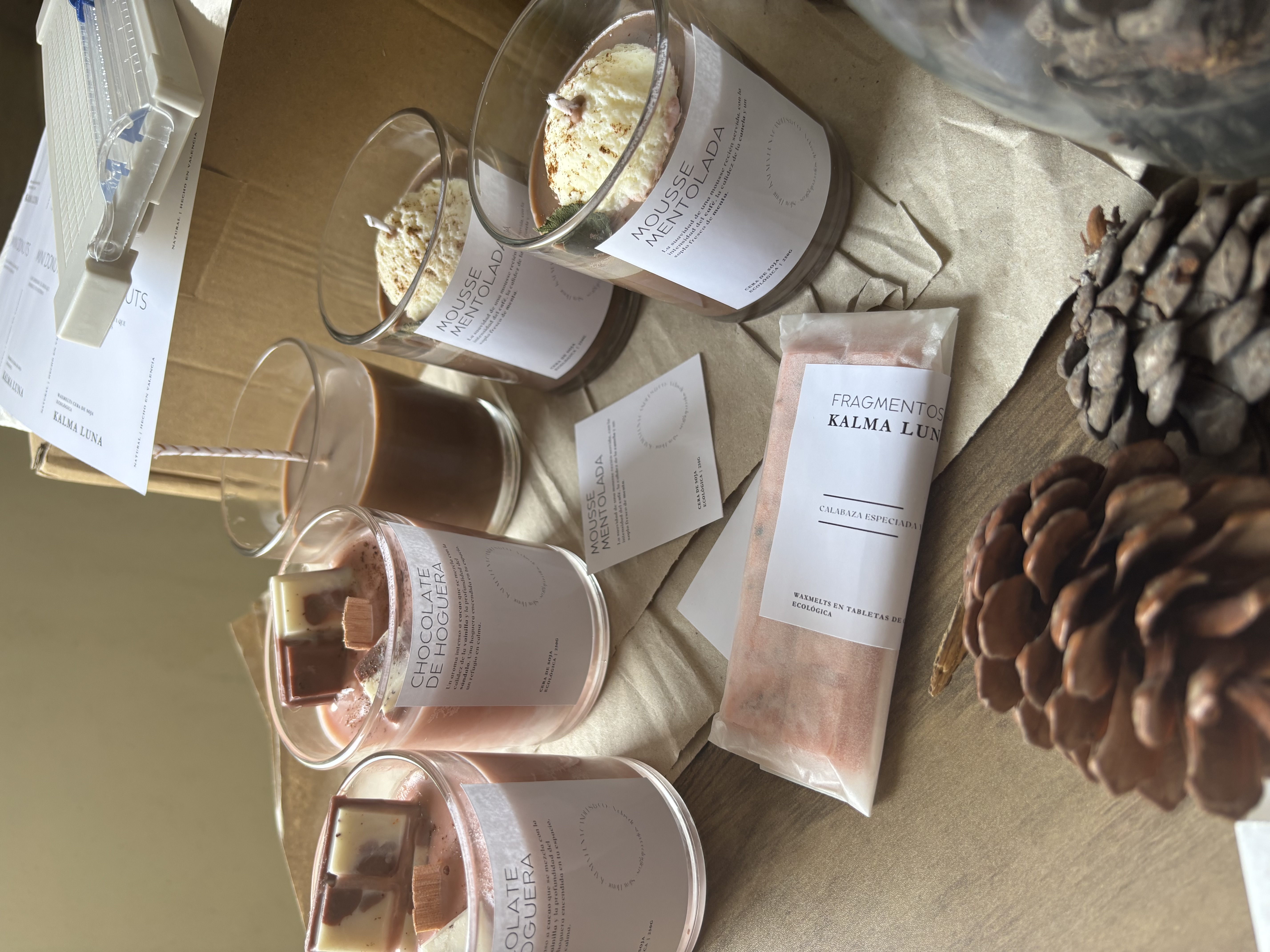 Trabajamos con cera de soja ecológica certificada, mechas de algodón y madera, esencias libres de tóxicos y packaging respetuoso con la naturaleza. Porque la calma también es cuidar del entorno que habitamos.